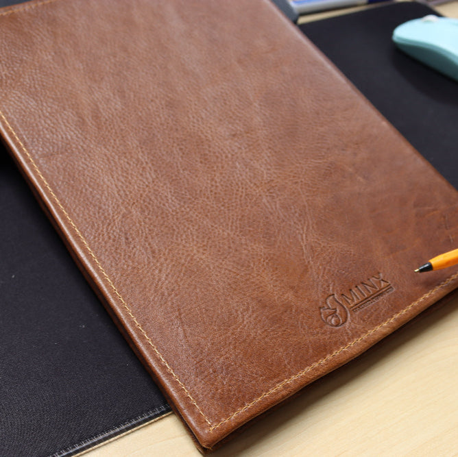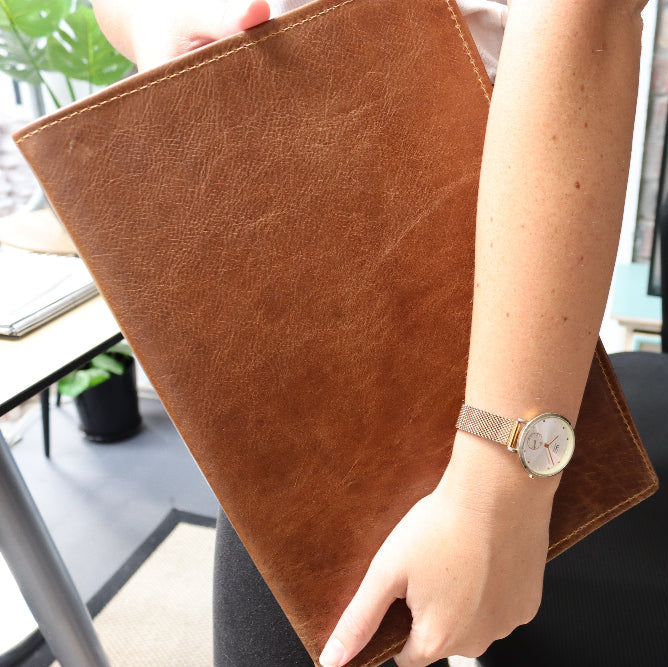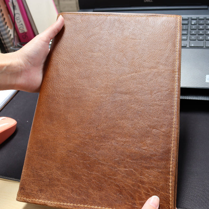 Crafted from premium genuine cow leather, our A4 Leather Book Cover adds sophistication to any book. Includes a book, making it the perfect lifetime gift. This product only gets better with age and use. Never cover your books again just slip on this beautiful leather sleeve.