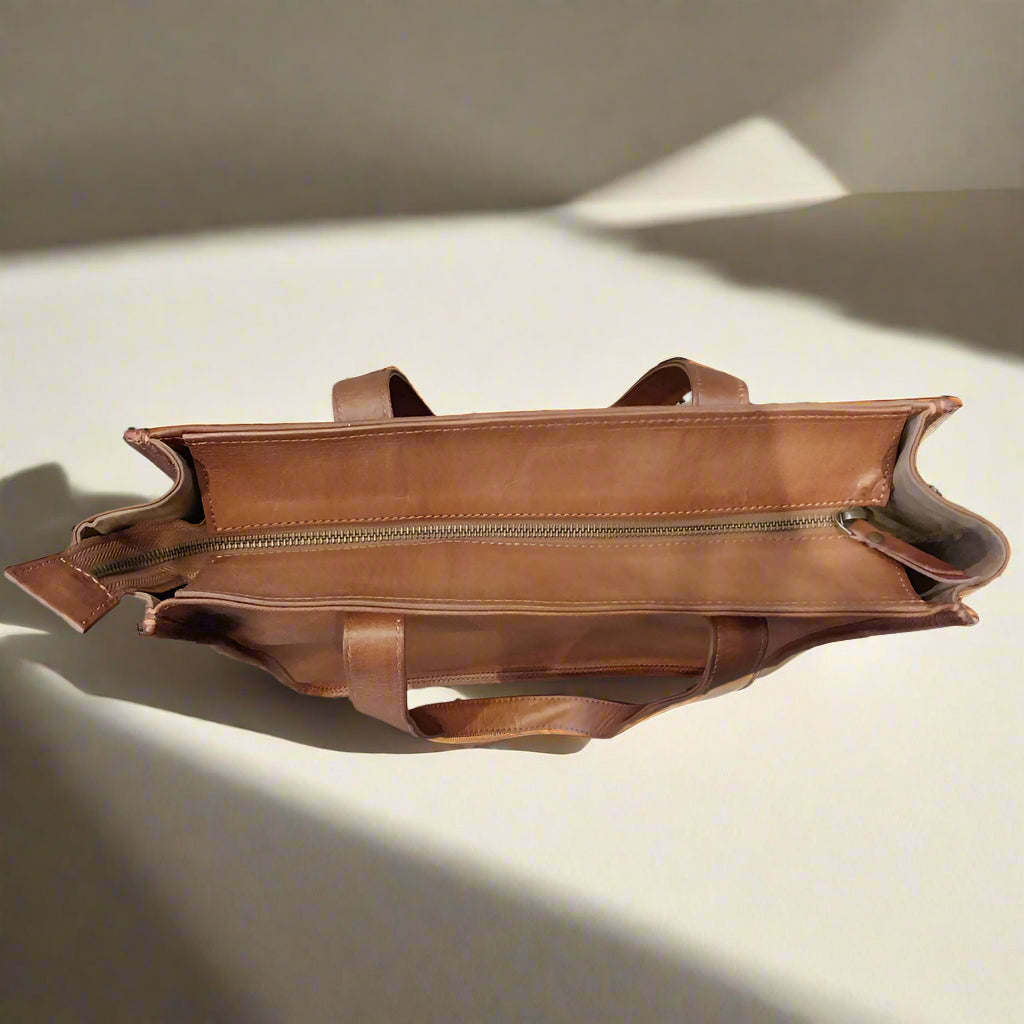 This stunning tan buffalo leather bag is the last one available on our shelves—don’t miss your chance to own this versatile and spacious piece!