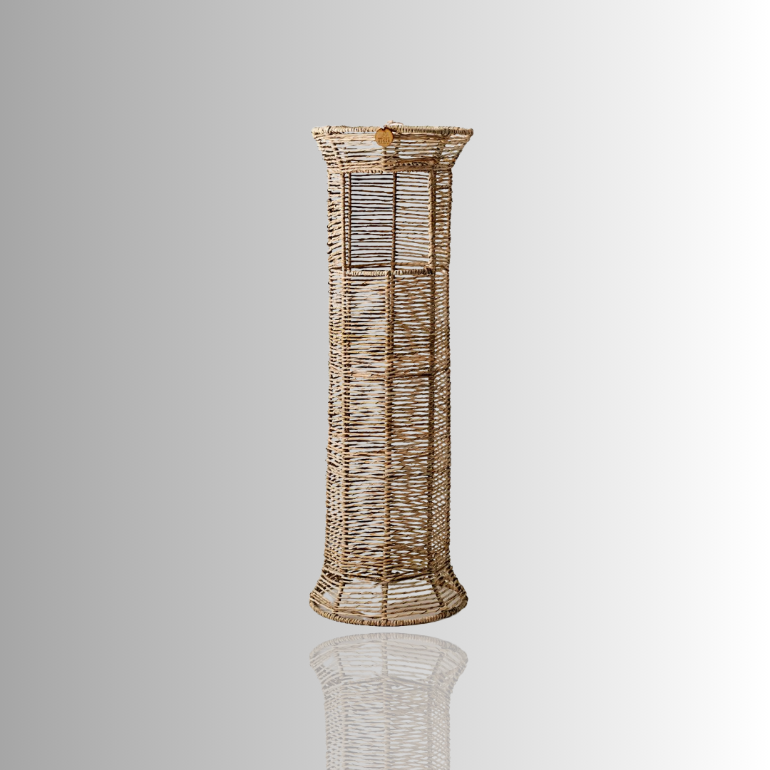 Transform your laundry routine with the KUKON Laundry Freestanding Space Saver. Made from sustainable Ilala Palm leaves and reinforced with durable steel, this piece combines elegance and functionality for any space.